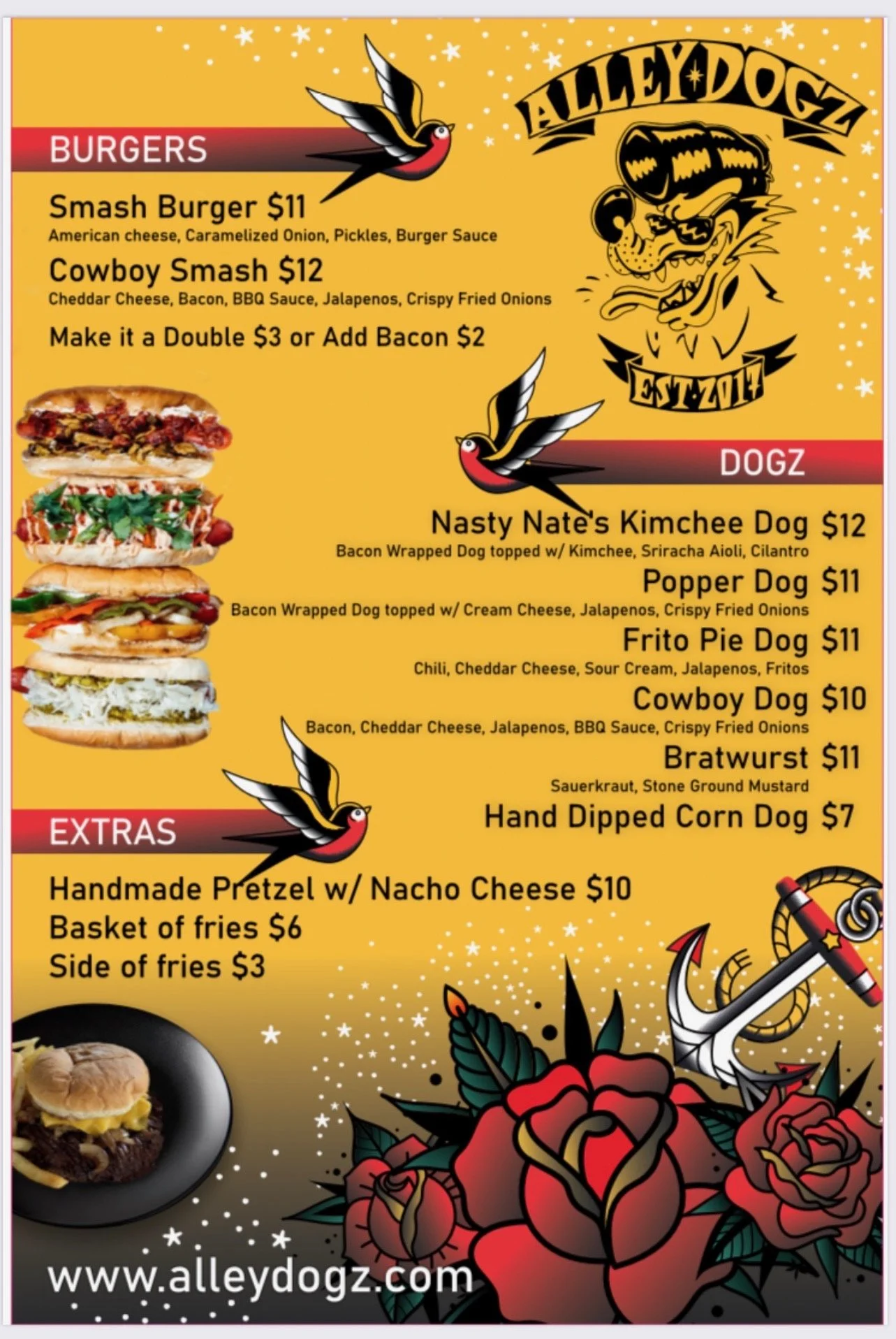 Alley Dogz is a Central Oregon favorite that’s been serving up serious street food since 2017. This local food cart specializes in fully loaded, custom-built hotdogs and crispy-edged smash burgers cooked fresh to order on a hot griddle. Whether you’re craving a classic dog with mustard and kraut or a piled-high creation stacked with bold sauces, grilled onions, and unexpected toppings, locally made pretzels or anyone of our custom smash burgers, you’ll be glad you chose to dine with us.